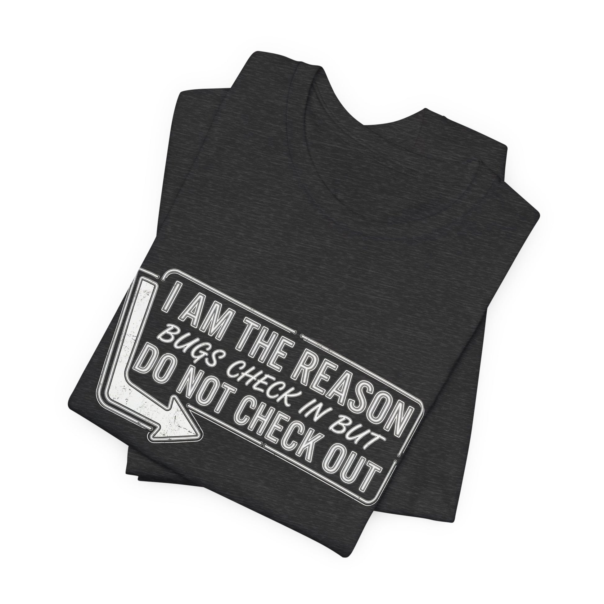 Bugs check in, but they definitely don't check out. This hilarious exterminator tee is perfect for pest control pros who deliver the final checkout notice. Soft Bella+Canvas 3001 unisex fit for comfort on every job.