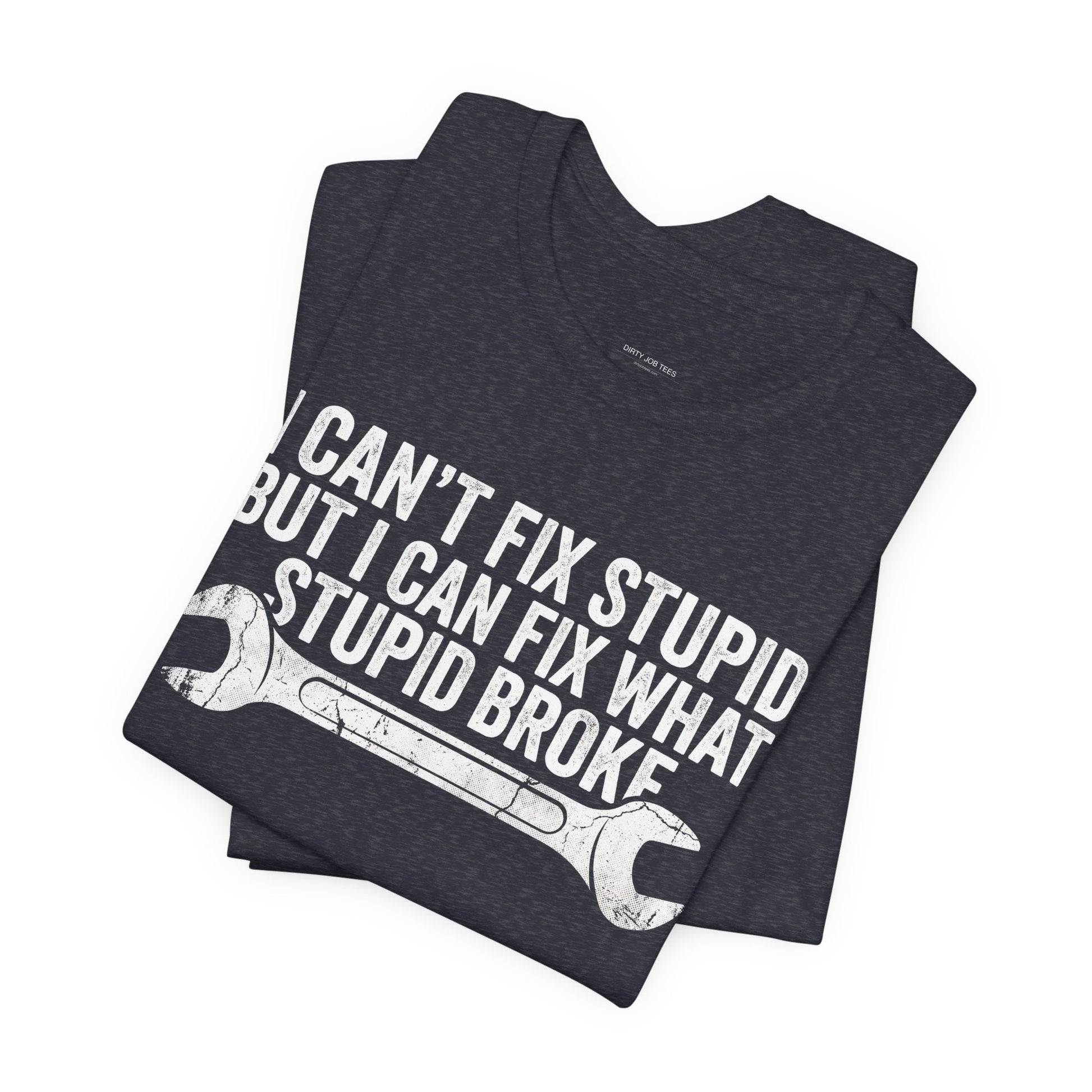 I Can't Fix Stupid But I Can Fix What Stupid Broke — the perfect slogan for every mechanic who's seen it all. Great gift for auto mechanics, gearheads, and anyone who works with their hands. Premium Bella+Canvas CVC tee.