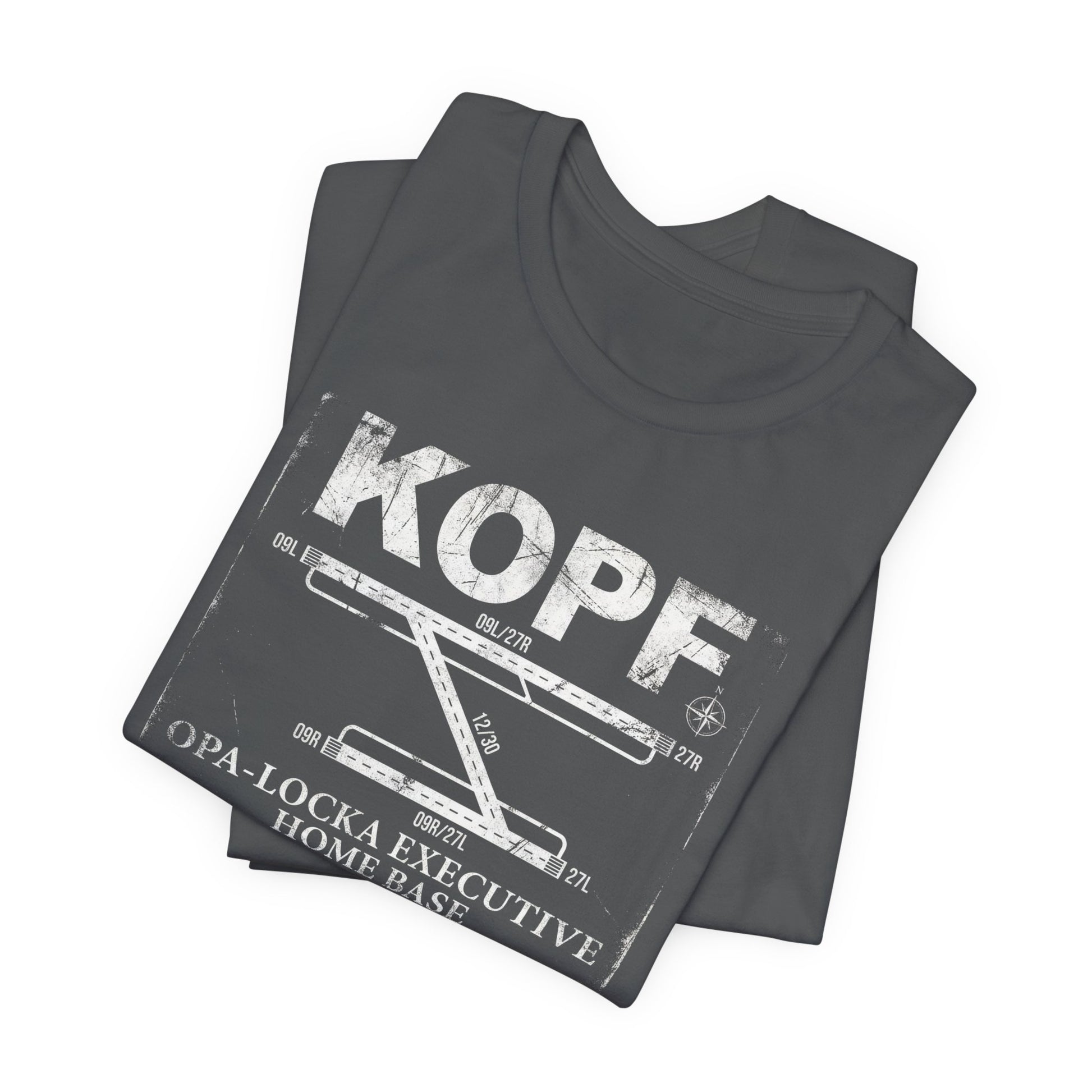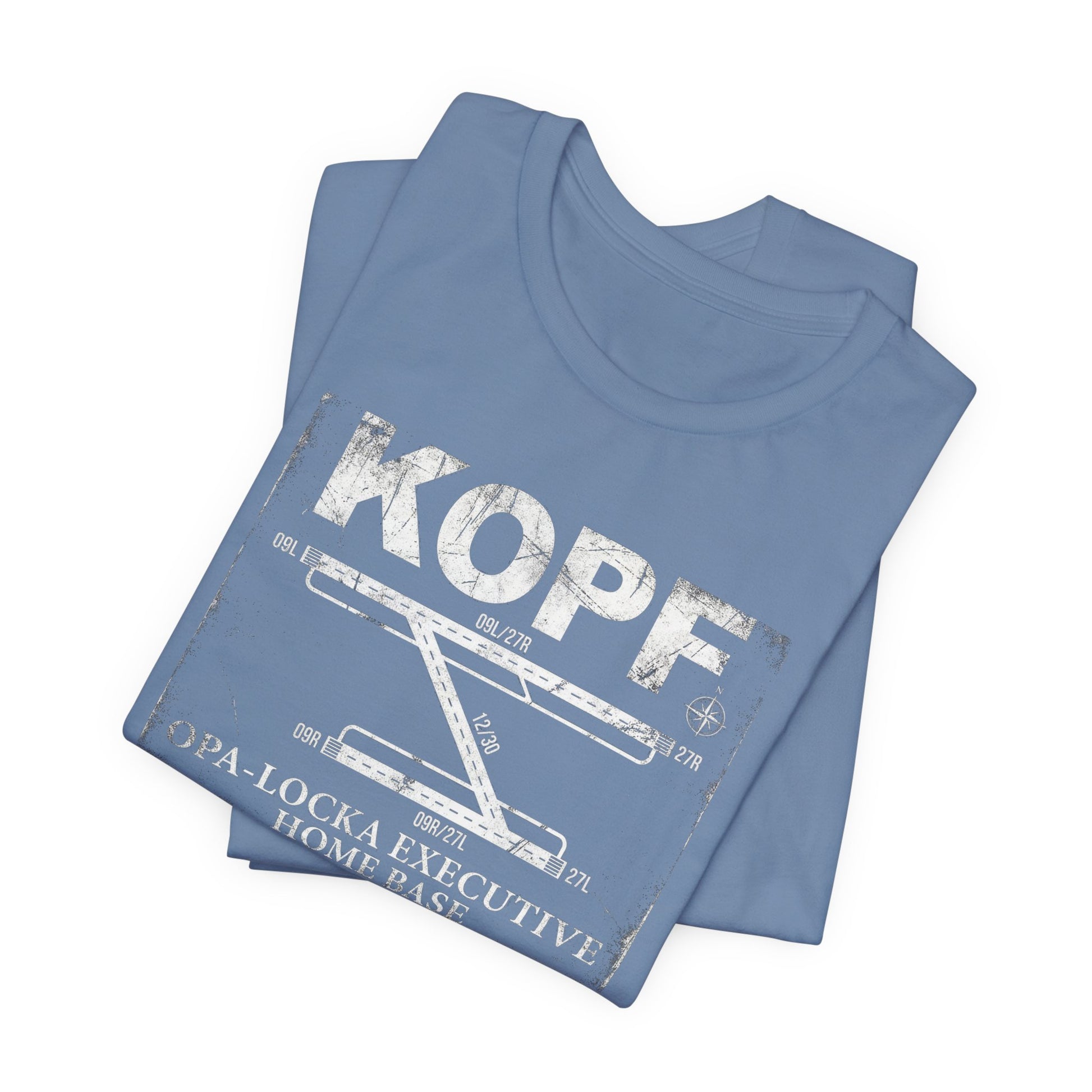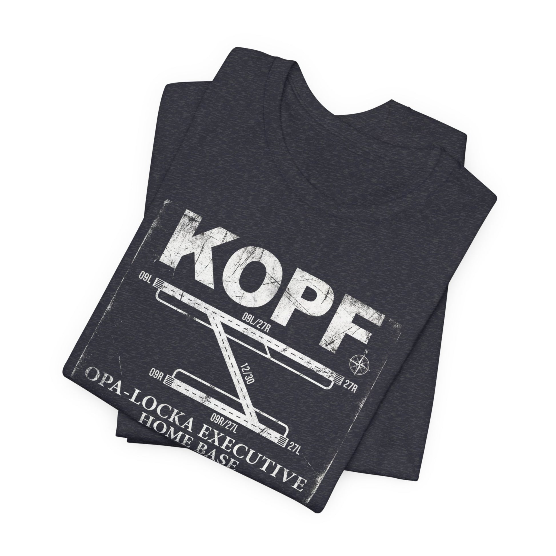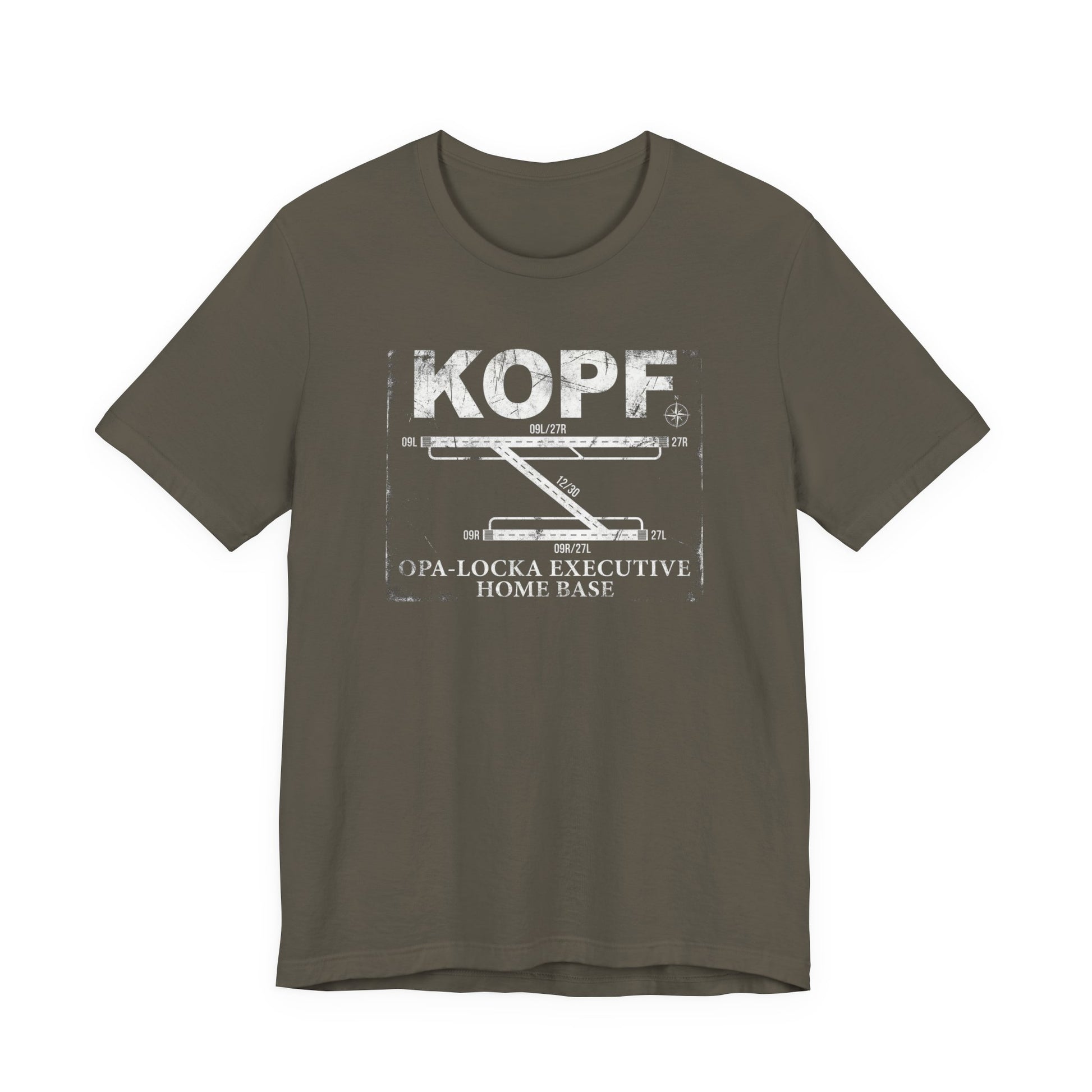 KOPF — Opa-Locka Executive Airport. Distressed vintage runway diagram with accurate 09L/27R, 12/30, and 09R/27L layout. Home base tee for OPF pilots. Premium Bella+Canvas CVC tee.