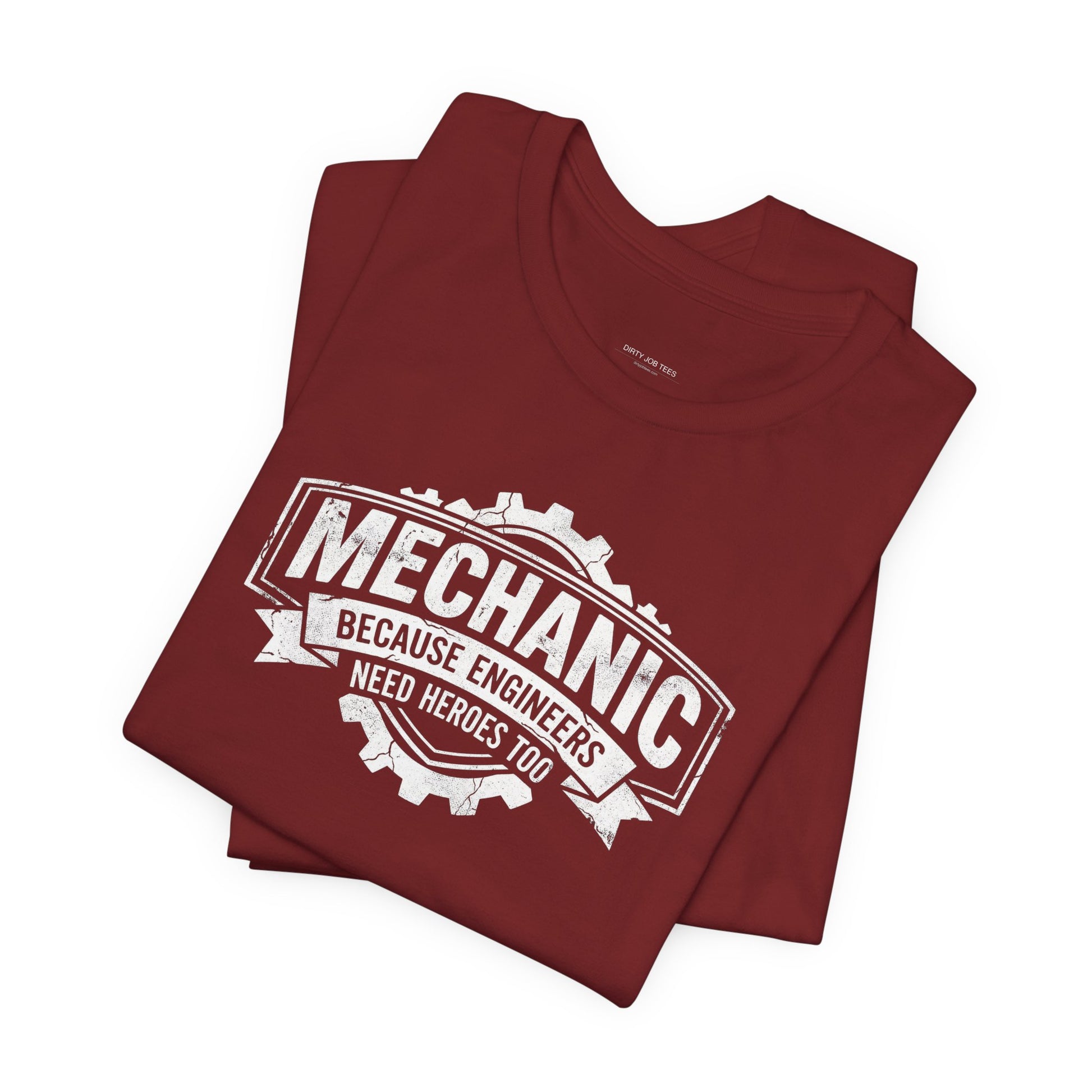 Mechanic — Because Engineers Need Heroes Too. A hilarious tribute to the real heroes who keep things running. Perfect for auto mechanics and blue collar workers. Premium Bella+Canvas CVC tee.