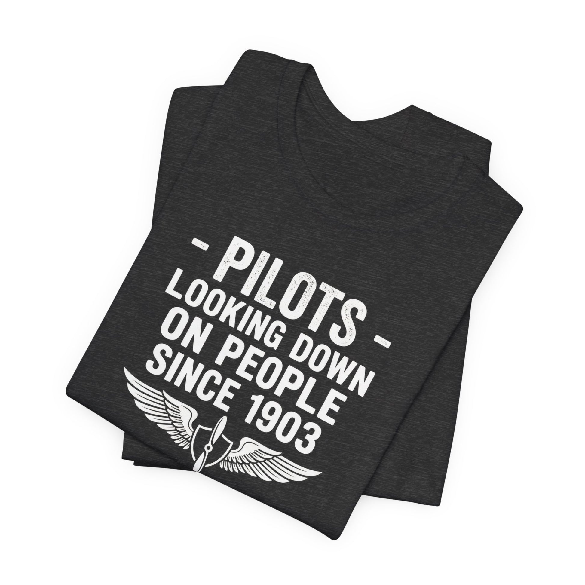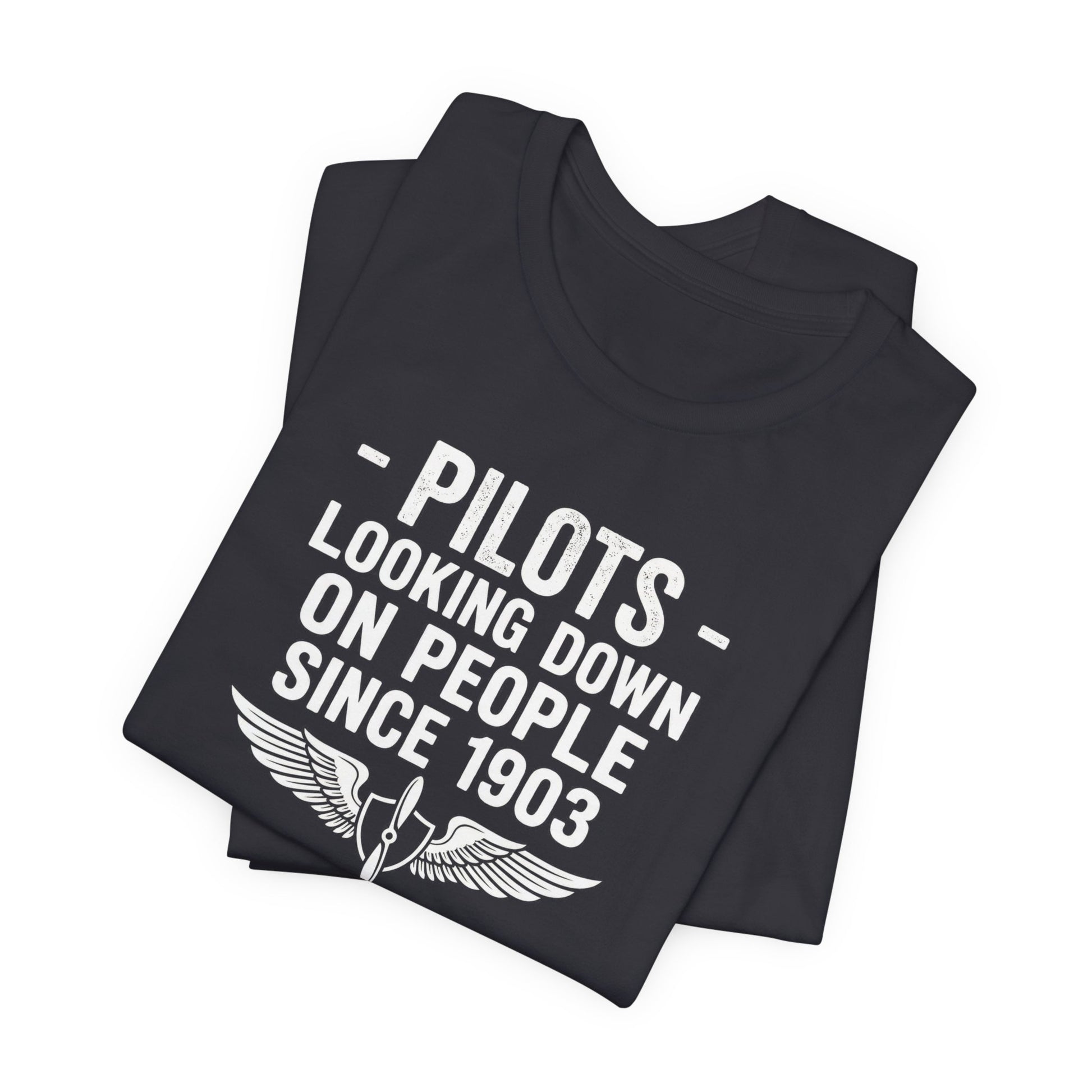 Pilots: Looking Down on People Since 1903. This sarcastic aviation tee features bold typography with aviator wings. Perfect for pilots, student pilots, aviation enthusiasts, and anyone who loves cocky pilot humor.