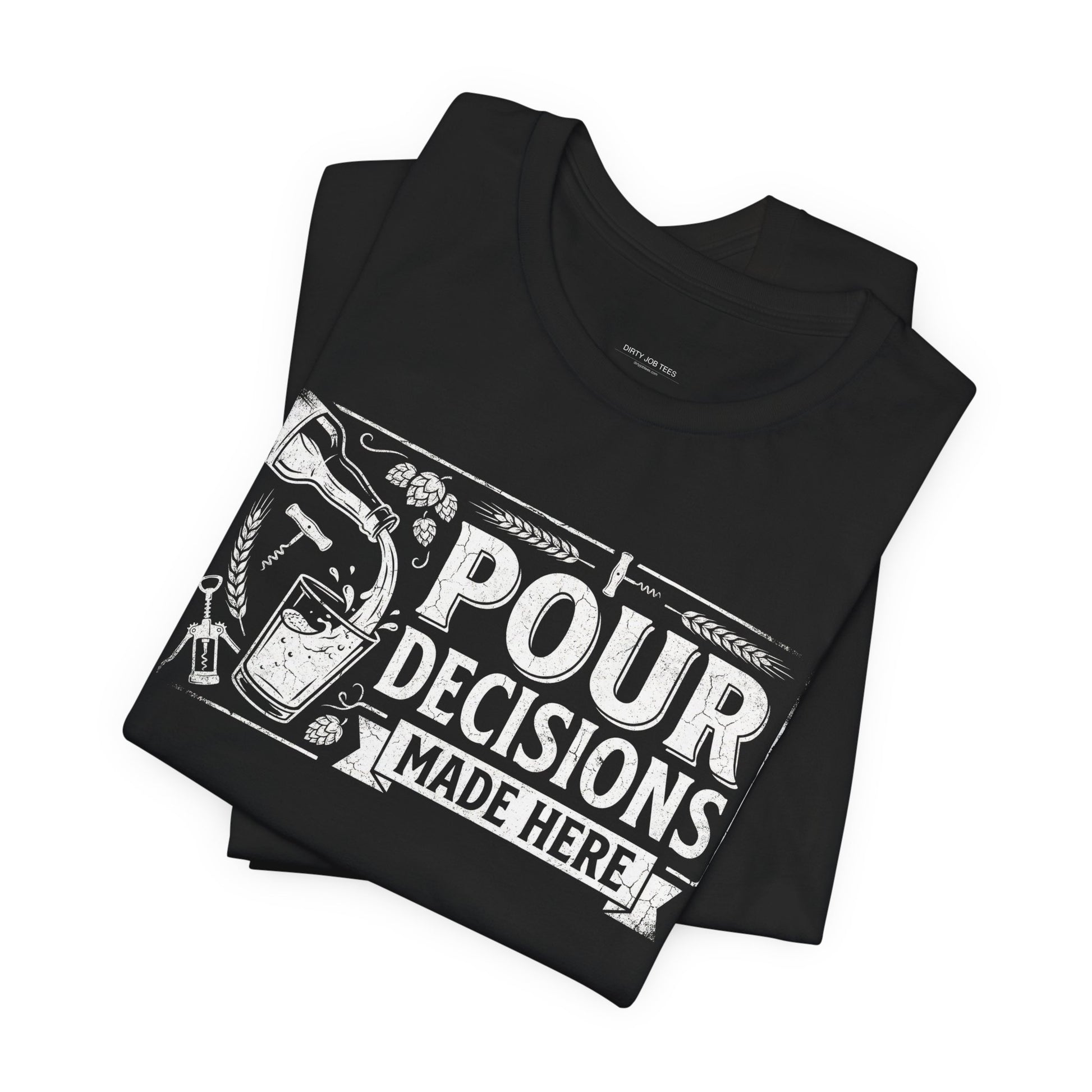Pour Decisions Made Here — the pun every bartender lives by. Perfect for mixologists, servers, and anyone who's ever had one too many behind the bar. Premium Bella+Canvas CVC tee.