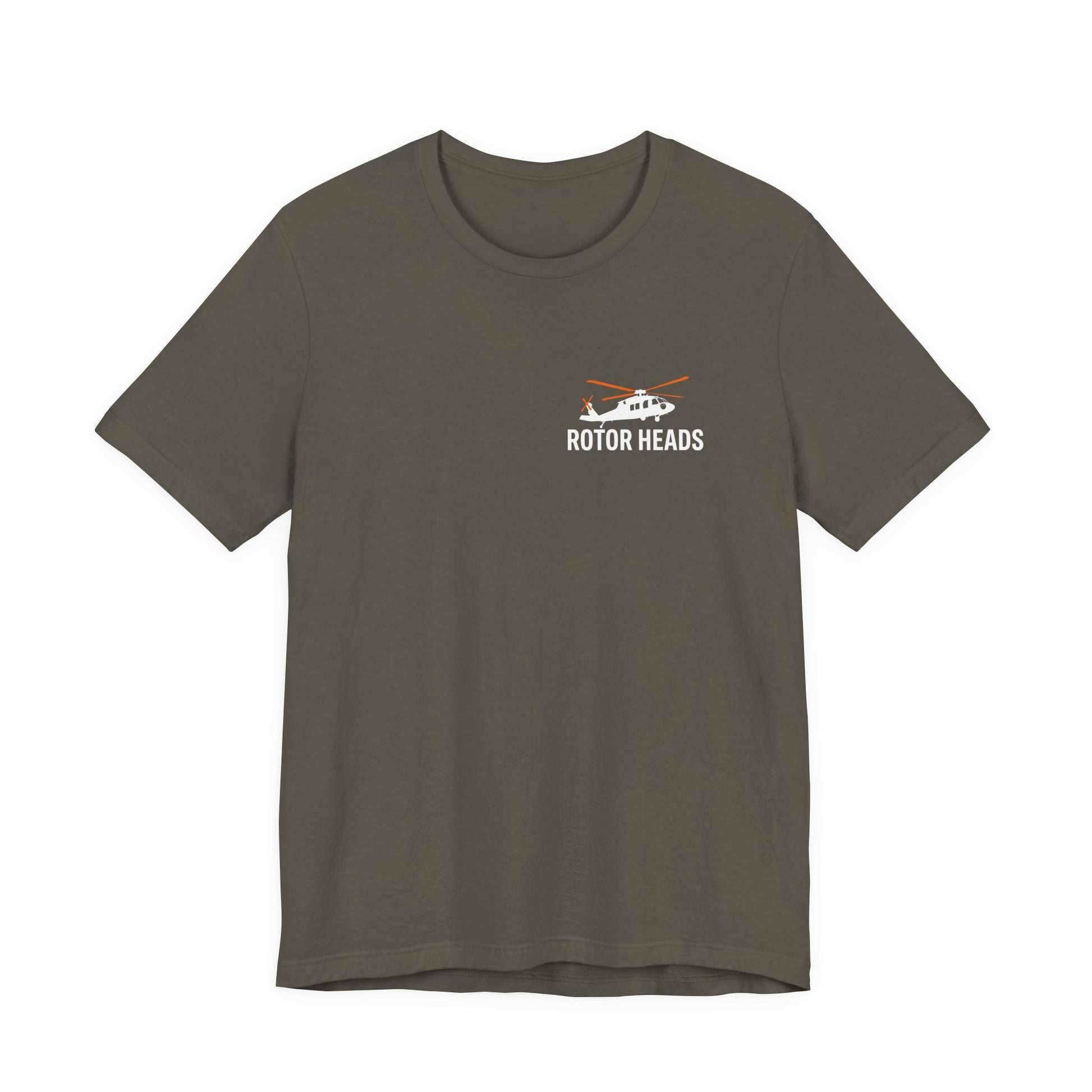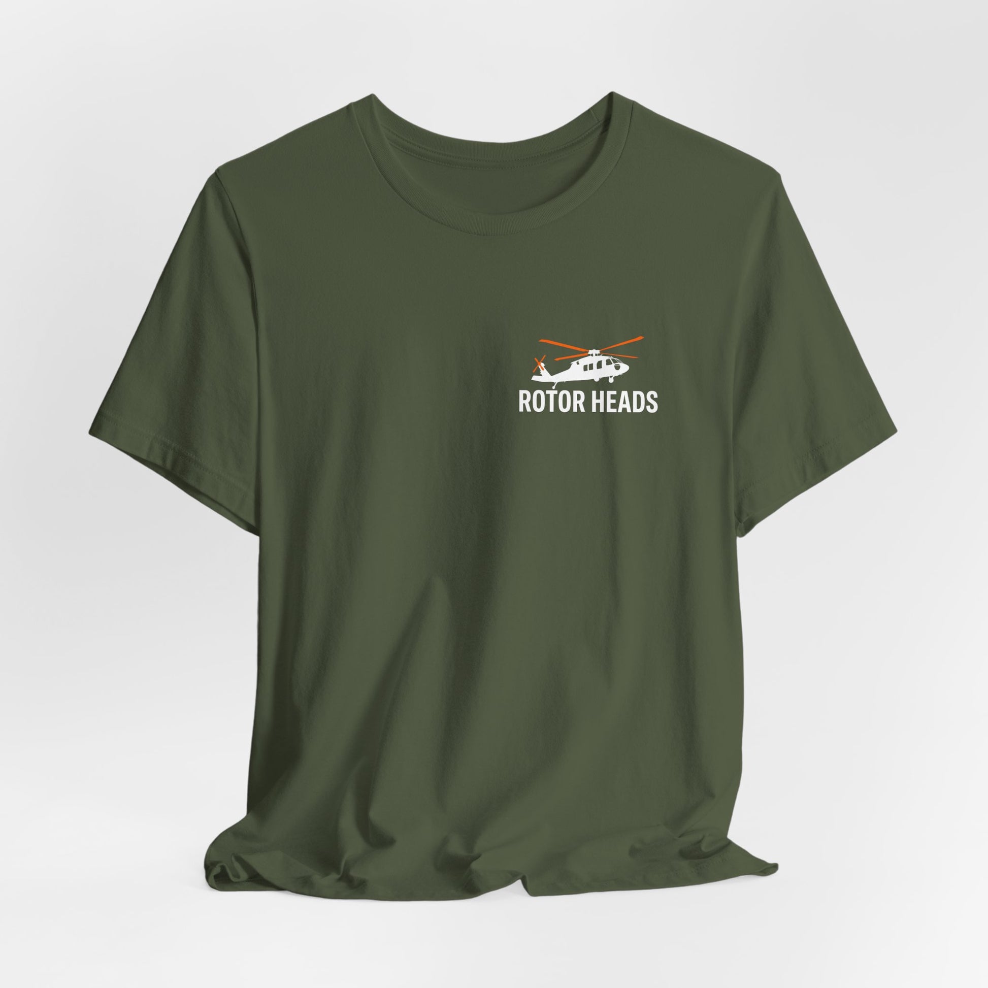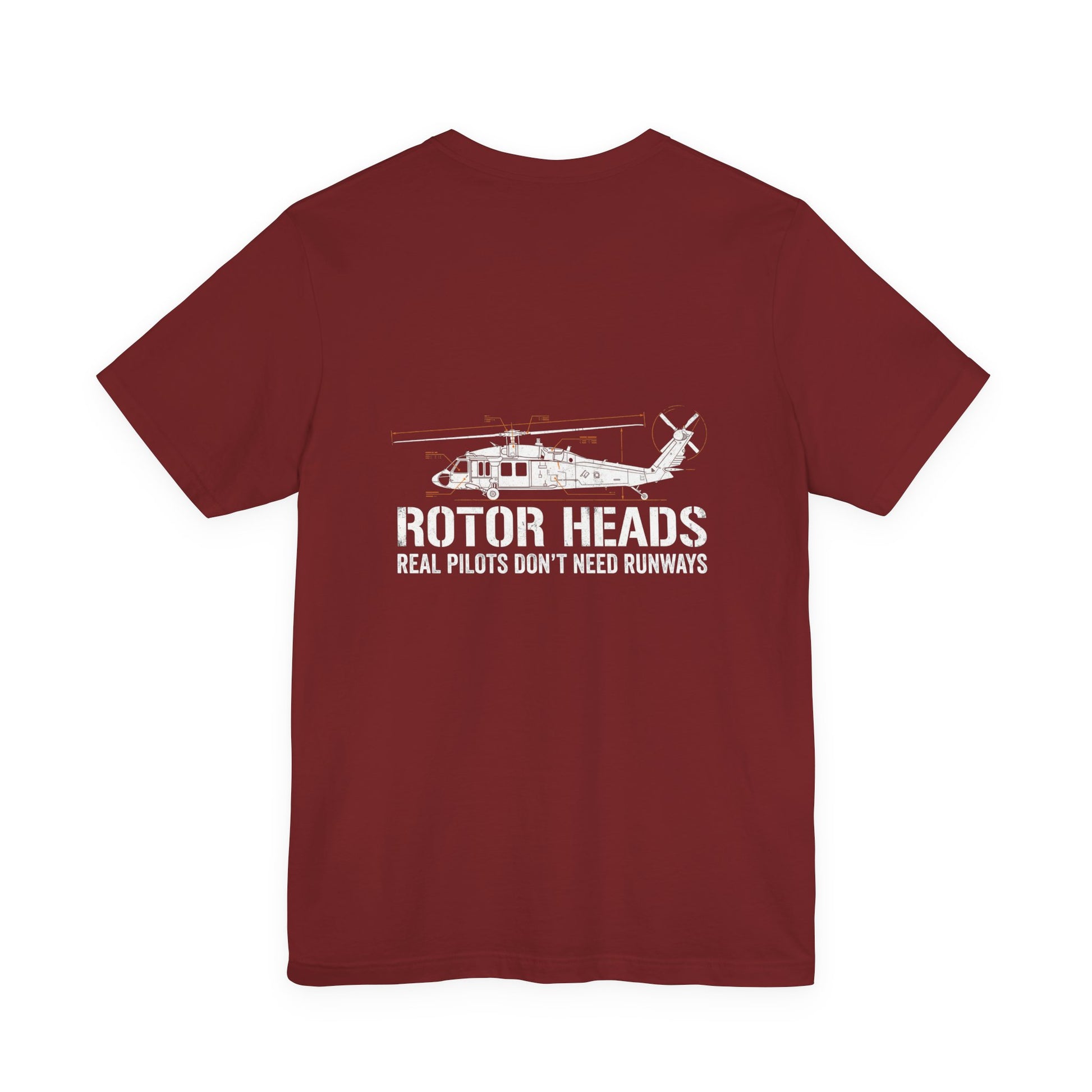 Small helicopter emblem on the front, full Rotor Heads graphic on the back. Real pilots don't need runways. Premium Bella+Canvas CVC tee with front and back print.